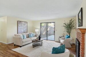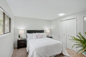 Step inside and you’re greeted with rich Red River Hickory CoreTec Luxury Vinyl Plank flooring flowing through the main living areas, anchored by a wood-burning fireplace and framed by windows that fill the space with natural light. A pocket door connects the living room to the kitchen – a detail that’s equal parts practical and charming. Storage is generous throughout, with a twin closet, additional closet, and built-ins that give every room a place for all your belongings.