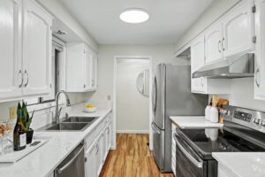 The kitchen is equipped with quartz countertops, a stainless-steel double-basin sink with a brushed nickel faucet, a built-in hood, and a comprehensive selection of stainless-steel appliances, including a Bosch dishwasher, a GE glass-top electric oven and range, and a Kenmore café-style double-door refrigerator and freezer. Everything you need to cook, entertain, and settle in is already here.