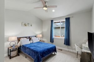 All three bedrooms feature large closets, ceiling fans, and low-pile carpet for a cozy feel, with the primary bedroom’s vaulted ceilings. The Owner’s Suite bathroom is a genuine retreat with dual under-mount sinks, brushed nickel fixtures, a stand-up shower with full-height tile, built-in storage and bench, and a walk-in closet with attic access. The second full bathroom mirrors the same quality with a soaking tub, brushed nickel fixtures, and matching quartz countertops and cabinetry throughout.