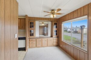 The kitchen offers plenty of cabinet storage, an electric stove with overhead hood vent, a double sink, and a dishwasher (currently not working). Off the kitchen, the living area feels warm and inviting with stained-glass light fixtures, a built-in mirrored hutch, and a ceiling fan—details that add character and functionality.