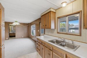 Outside, aluminum siding and a black membrane roof help minimize upkeep. Covered entries on both sides add day-to-day convenience, while a one-car carport with a built-in shed, a second standalone shed, and extra paved space offer ample room for vehicles, tools, and storage. Ramp access on one side provides added ease of entry, and the front planter box area gives you a simple way to personalize the exterior.